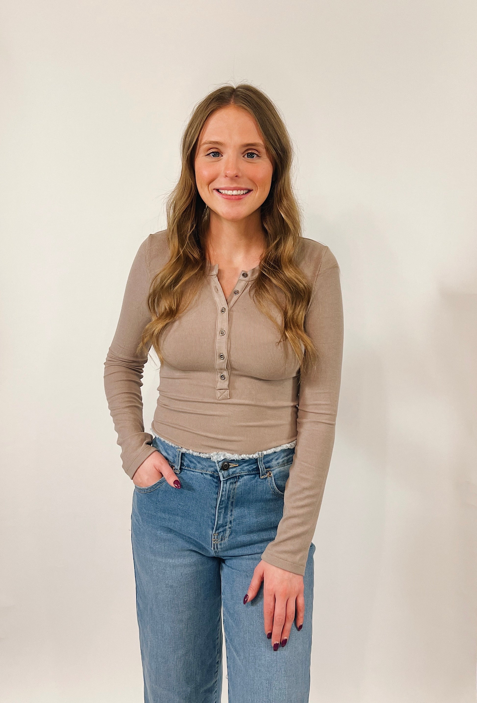 Your new everyday fave. This mocha ribbed knit top has the perfect mix of comfy and cute. The soft, stretchy fabric feels amazing on, and the half button-up detail gives it that effortless look you can dress up or down. Easy to layer— basically the kind of top you’ll reach for over and over again.